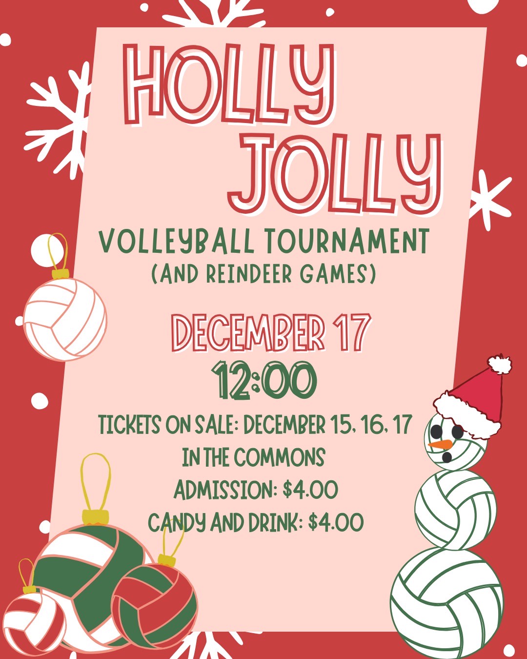 Holly Jolly Volleyball Tournament ticket sales dates 12/15, 12/16/, 12/17.... $4 admission & $4 candy & drink